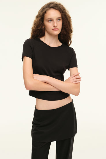 A fitted silhouette T-shirt. A basic shape with an attitude that works well on its own or layered.