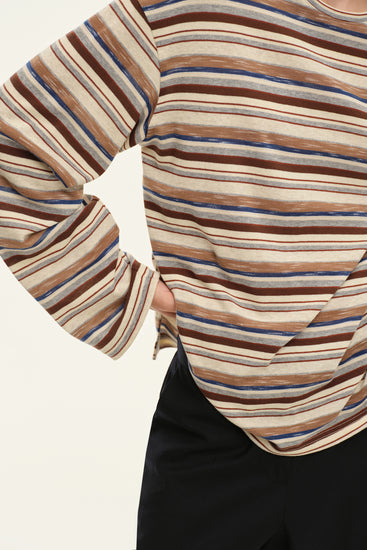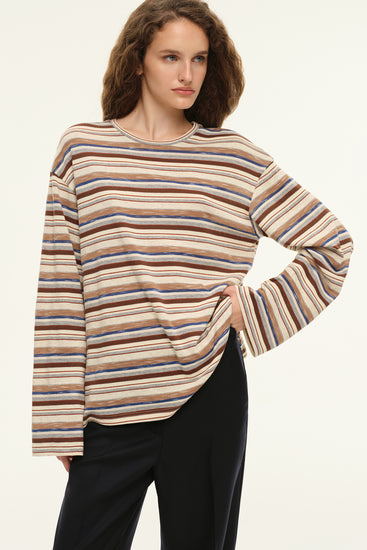 Oversized longsleeve with a U-shaped neckline, dropped shoulder line, straight silhouette and mid-thigh length. Made from natural cotton with a bright striped print.